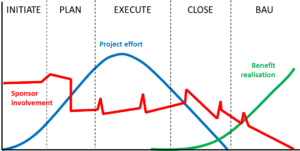 How much sponsors are involved will vary during the lifecycle of the project, as the graphic below shows. To begin with they have a high level of involvement, ensuring that the project is properly set and making sure that it will yield the benefits that they want. Once the planning has been done, involvement is lower apart from regular steering group or review meetings