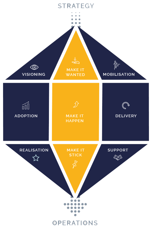 CITI’s Change Diamond™ helps to identify the approaches needed to bring about successful change, with each area focusing on the activities and deliverables required to turn strategy into operational reality for your project.